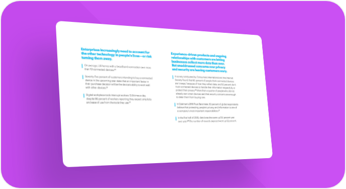 Enterprises increasingly need to account for Experience-driven products and ongoing the other technology in people’s lives—or risk relationships with customers are letting turning them away. businesses collect more data than ever. But unaddressed concerns over privacy On average, US homes with a broadband connection own more and security are leaving customers wary. than 10 connected devices.23 A survey conducted by Consumers International and the Internet Seventy-five percent of customers intending to buy a connected Society found that 63 percent of people think connected devices device in the upcoming year state that an important factor in are ‘creepy,’ because of how they collect data, and 53 percent don’t their purchase decision will be the device’s ability to work well trust connected devices to handle their information respectfully or with other devices.24 26 protect their privacy. More than a quarter of people who did not already own smart devices said that security concerns are enough Digital workplace tools interrupt workers 13.9 times a day, to deter them from buying one. despite 86 percent of workers reporting they expect simplicity and ease of use from the tools they use.25 In Edelman’s 2018 Trust Barometer, 83 percent of global respondents believe that protecting people’s privacy and information is one of 27 a company’s most important responsibilities. In the first half of 2019, data breaches were up 54 percent year 28 over year. The number of records exposed went up 52 percent.