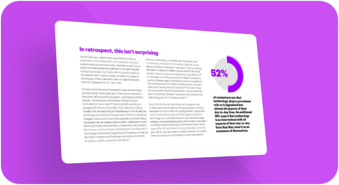 In retrospect, this isn’t surprising Just 20 years ago, digital access was limited by dial-up Not only is technology a symbiotic part of people’s lives, connections and desktop PCs, and individuals remained it’s also being embedded in the building blocks of society. predominantly anonymous online. Tools like e-mail, forums Take the evolution underway in education: China is investing and e-commerce were more efficient or far-reaching than $30 billion in edtech by 2020 to ensure its 230 million K-12 analog counterparts, but hardly vital to people’s existence. students have access to individualized learning platforms.6,7 52% Companies didn’t need to closely consider the impact of In Indonesia, non-profit group Room to Read is closing the technology in their customers’ lives; our digital lives were country’s illiteracy gap by building an open-source platform distinctly separate from our “real” ones. that provides access to children’s stories, literacy education 8,9 videos and training videos for teachers. And technology It’s hard to find that kind of separation today as technology isn’t just transforming how people learn, but also what they has become an inextricable part of the human experience. learn: bootcamps that teach coding and web development 10 of consumers say that More than half the world’s population—a whopping 4.5 billion skills have grown 11x in the last six years. 1 people—have access to the internet. People are ever- technology plays a prominent connected on every type of device, globally spending an Given the starring role technology has in people’s lives, role or is ingrained into 2 average of 6.4 hours online daily. Even distinctions about it makes sense that we take technology personally—and why almost all aspects of their “screen-time” are becoming an obsolete way to look at reality as we expect so much more from it going forward. Just as many day-to-day lives. An additional technology permeates the physical world. Daimler is integrating current models fail to account for the growing impact of 19% report that technology intelligent voice control into its Mercedes-Benz vehicles, letting technology, our unconditional love for unlimited technology 3 is so intertwined with all drivers ask their car questions about traffic, weather and more. is fading. Some are labelling today’s environment a “tech-lash,” aspects of their day-to-day Samsung’s digital assistant Bixby is interacting with people in or backlash against technology. But that description fails to their homes via the company’s FamilyHub line of refrigerators.4 account for the fact that we’re using technology more than lives that they view it as an And the last mile is becoming a thing of the past as companies ever. Rather, it’s a tech-clash—a collision between old models extension of themselves. like FedEx, Amazon and Postmates use robots and drones that are incongruous with people’s current expectations. for delivery right to customers’ doorsteps.5
