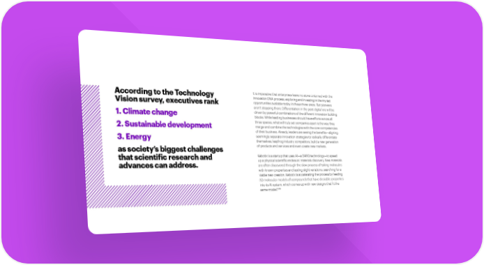 According to the Technology It is imperative that enterprises leave no stone unturned with the innovation DNA process, exploring and investing in the myriad Vision survey, executives rank opportunities available today in these three areas. But pioneers aren’t stopping there. Differentiation in the post-digital era will be 1. Climate change driven by powerful combinations of the different innovation building blocks. While leading businesses should have efforts across all three spaces, what will truly set companies apart is the way they 2.Sustainable development merge and combine the technologies with the core competencies of their business. Already, leaders are seeing the benefits—aligning 3.Energy seemingly separate innovation strategies to radically differentiate themselves, leapfrog industry competitors, build a new generation as society’s biggest challenges of products and services and even create new markets. that scientific research and Kebotix is a startup that uses AI—a DARQ technology—to speed up a physical scientific endeavor: materials discovery. New materials advances can address. are often discovered through the slow process of taking molecules with known properties and testing slight variations, searching for a viable new creation. Kebotix is accelerating the process by feeding 3D molecular models of compounds that have desirable properties into its AI system, which comes up with new designs that fit the 13,14 same model.