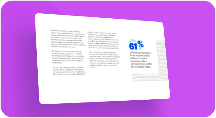 Companies have already seen the benefits of in 2016—and those fleets of robots won’t deploy 13 robotics in controlled spaces, from lower production or maintain themselves. Savvy businesses are costs, to higher productivity and increased capacity investing in robotics hiring today, driving a for analytics. Open world autonomy will amplify 121 percent jump in demand for robotics technicians 14 these benefits further—and, as these examples since 2017. This is followed closely by the people show, it’s already unlocking new capabilities and who will handle all the data those robots gather and % opportunities in industries that have not traditionally generate: data scientists, a profession that saw an benefited from robotics in the past. 88 percent increase in demand from 2018 to 2019. 6611 These opportunities don’t come free, though. Just as important is the reality that not every of executives expect As robots become feasible in more industries, company will be able to find the ready expertise their organizations the challenges and limitations that only robotics in the talent market. Existing degree and certificate will use robotics companies have dealt with in the past are now programs can’t meet this exploding demand for obstacles and opportunities every enterprise talent, and leaders know it. Already, 84 percent of in uncontrolled must consider. employers have talked about plans to upskill their environments within workforces by 2020—up from just 21 percent the next two years. 15 The first major challenge will be the necessary in 2011. talent investments. The global mobile robotics market is projected to grow to nearly $31 billion by 2025—a 361 percent increase from $8.58 billion