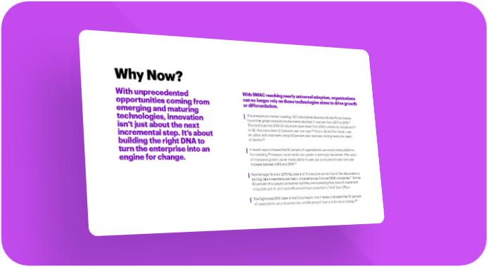 Why Now? With unprecedented With SMAC reaching nearly universal adoption, organizations opportunities coming from can no longer rely on these technologies alone to drive growth emerging and maturing or differentiation. The smartphone market is stalling. IDC’s Worldwide Quarterly Mobile Phone Tracker technologies, innovation 31 found that global smartphone shipments declined 4.1 percent from 2017 to 2018. 32 isn’t just about the next This continued into 2019: Q1 shipments were down from 2018 numbers by 6.6 percent. 33 In Q2, they were down 2.3 percent year over year. Only in Q3 did the industry see incremental step. It’s about an uptick, with shipments rising 0.8 percent year over year, ending nearly two years building the right DNA to of decline.34 turn the enterprise into an A recent report showed that 91 percent of organizations use social media platforms 35 engine for change. for marketing. However, social media user growth is starting to decelerate. After years of impressive growth, social media platforms saw just a one percent year-over-year increase between 2018 and 2019.36 NewVantage Partners’ 2019 Big Data and AI Executive survey found that data analytics 37 and big data investments are nearly universal across Fortune 1000 companies. Almost 92 percent of surveyed companies said they are increasing their pace of investment in big data and AI, and nearly 68 percent have appointed a Chief Data Officer. The RightScale 2019 State of the Cloud report, from Flexera, indicated that 94 percent of respondents use a cloud service, and 84 percent have a multi-cloud strategy.38