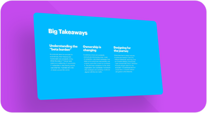 Big Takeaways Understanding the Ownership is Designing for “beta burden” changing the journey As products become conduits for Experience-driven and updatable Enterprises have to design products experiences, their features and products are introducing a new model to evolve and transform over time, functionality are constantly in flux. of ownership—one where businesses must while simultaneously becoming more While this state of “forever beta” retain some control and responsibility over comfortable releasing products they opens up a wellspring of opportunity, a device, even after a customer purchases might conventionally see as “unfinished.” if mishandled it risks leaving people it. This shift has implications for the whole Products will gain value from the overwhelmed, frustrated and wary organization, and businesses must ensure ecosystem of experiences that form of what’s around the corner. their strategies and operating models are around them, if properly fostered aligned with this new reality. and guided by the enterprise.