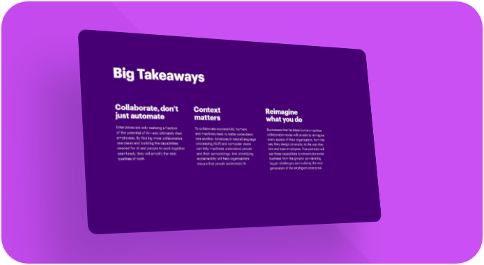 Big Takeaways Collaborate, don’t Context Reimagine just automate matters what you do Enterprises are only realizing a fraction To collaborate successfully, humans Businesses that facilitate human-machine of the potential of AI—and ultimately their and machines need to better understand collaboration today will be able to reimagine employees. By finding more collaborative one another. Advances in natural language every aspect of their organization, from the use cases and building the capabilities processing (NLP) and computer vision way they design products, to the way they needed for AI and people to work together can help machines understand people hire and train employees. True pioneers will seamlessly, they will amplify the best and their surroundings. And prioritizing use these capabilities to reinvent the entire qualities of both. explainability will help organizations business from the ground up—tackling ensure that people understand AI. bigger challenges and building the next generation of the intelligent enterprise.