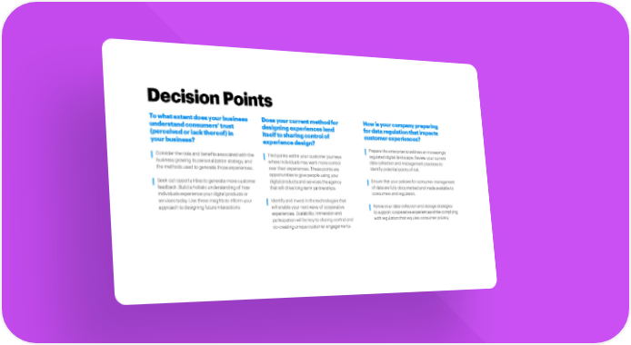 Decision Points To what extent does your business Does your current method for How is your company preparing understand consumers’ trust designing experiences lend for data regulation that impacts (perceived or lack thereof) in itself to sharing control of customer experiences? your business? experience design? P repare the enterprise to address an increasingly Consider the risks and benefits associated with the Find points within your customer journeys regulated digital landscape. Review your current business growing its personalization strategy, and where individuals may want more control data collection and management practices to the methods used to generate those experiences. over their experiences. These points are identify potential points of risk. opportunities to give people using your Seek out opportunities to generate more customer digital products and services the agency E nsure that your policies for consumer management feedback. Build a holistic understanding of how that will drive long-term partnerships. of data are fully documented and made available to individuals experience your digital products or consumers and regulators. services today. Use these insights to inform your Identify and invest in the technologies that approach to designing future interactions. will enable your next wave of cooperative R evise your data collection and storage strategies experiences. Scalability, immersion and to support cooperative experiences while complying participation will be key to sharing control and with regulation that requires consumer privacy. co-creating unique customer engagements.