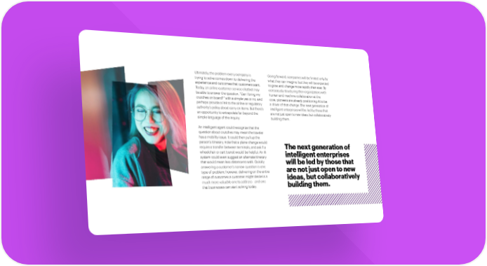 Ultimately, the problem every company is Going forward, companies will be limited only by trying to solve comes down to delivering the what they can imagine, but they will be expected experience and outcomes that customers want. to grow and change more rapidly than ever. By Today, an airline customer service chatbot may consciously structuring their organizations with be able to answer the question, “Can I bring my human and machine collaboration at the crutches on board?” with a simple yes or no, and core, pioneers are already positioning AI to be perhaps provide a link to the airline or regulatory a driver of that change. The next generation of authority’s policy about carry-on items. But there’s intelligent enterprises will be led by those that an opportunity to extrapolate far beyond the are not just open to new ideas, but collaboratively simple language of the inquiry. building them. An intelligent agent could recognize that the question about crutches may mean the traveler has a mobility issue. It could then pull up the person’s itinerary, note that a plane change would require a transfer between terminals, and ask if a The next generation of wheelchair or cart transit would be helpful. An AI intelligent enterprises system could even suggest an alternate itinerary that would mean less distance to walk. Quickly will be led by those that answering a customer’s narrow question is one are not just open to new type of problem; however, delivering on the entire range of outcomes a customer might desire is a ideas, but collaboratively much more valuable one to address—and one that businesses can start solving today. building them.