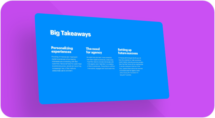 Big Takeaways Personalizing The need Setting up experiences for agency future success Providing immersive and meaningful As customers demand more ownership Emerging technologies like 5G and AR digital experiences is how leading over their digital experiences, enterprises have the potential to make experience businesses are connecting with their must find ways to provide individuals with customization ubiquitous across people’s customers. But as demand for customized more agency and make them co-creators lives. But that future will be unachievable experiences grows, people are becoming of their experiences. Those that do will find if people continue to feel out of the increasingly wary of the methods more active, engaged and loyal customers. loop. Leaders that explore new avenues enterprises use to provide it. to include customer agency today will be laying the foundation for long-term success.