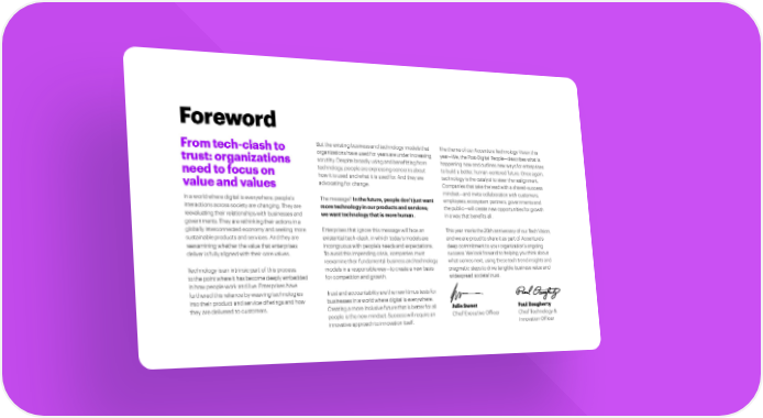 Foreword From tech-clash to But the existing business and technology models that The theme of our Accenture Technology Vision this organizations have used for years are under increasing year—We, the Post-Digital People—describes what is trust: organizations scrutiny. Despite broadly using and benefitting from happening now and outlines new ways for enterprises need to focus on technology, people are expressing concerns about to build a better, human-centered future. Once again, how it is used and what it is used for. And they are technology is the catalyst to steer the realignment. value and values advocating for change. Companies that take the lead with a shared-success mindset—and invite collaboration with customers, In a world where digital is everywhere, people’s The message? In the future, people don’t just want employees, ecosystem partners, governments and interactions across society are changing. They are more technology in our products and services; the public—will create new opportunities for growth reevaluating their relationships with businesses and we want technology that is more human. in a way that benefits all. governments. They are rethinking their actions in a globally interconnected economy and seeking more Enterprises that ignore this message will face an This year marks the 20th anniversary of our Tech Vision, sustainable products and services. And they are existential tech-clash, in which today’s models are and we are proud to share it as part of Accenture’s reexamining whether the value that enterprises incongruous with people’s needs and expectations. deep commitment to your organization’s ongoing deliver is fully aligned with their core values. To avoid this impending crisis, companies must success. We look forward to helping you think about reexamine their fundamental business and technology what comes next, using these tech trend insights and Technology is an intrinsic part of this process, models in a responsible way—to create a new basis pragmatic steps to drive tangible business value and to the point where it has become deeply embedded for competition and growth. widespread societal trust. in how people work and live. Enterprises have furthered this reliance by weaving technologies Trust and accountability are the new litmus tests for into their product and service offerings and how businesses in a world where digital is everywhere. they are delivered to customers. Creating a more inclusive future that is better for all Julie Sweet Paul Daugherty people is the new mindset. Success will require an Chief Executive Officer Chief Technology & innovative approach to innovation itself. Innovation Officer