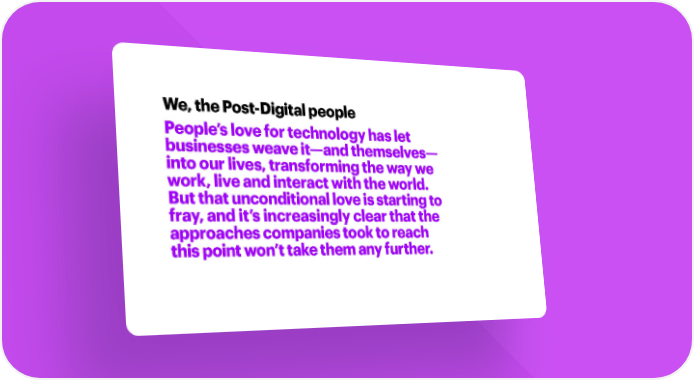 We, the Post-Digital people People’s love for technology has let businesses weave it—and themselves— into our lives, transforming the way we work, live and interact with the world. But that unconditional love is starting to fray, and it’s increasingly clear that the approaches companies took to reach this point won’t take them any further.