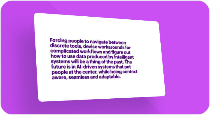 Forcing people to navigate between discrete tools, devise workarounds for complicated workflows and figure out how to use data produced by intelligent systems will be a thing of the past. The future is in AI-driven systems that put people at the center, while being context aware, seamless and adaptable.