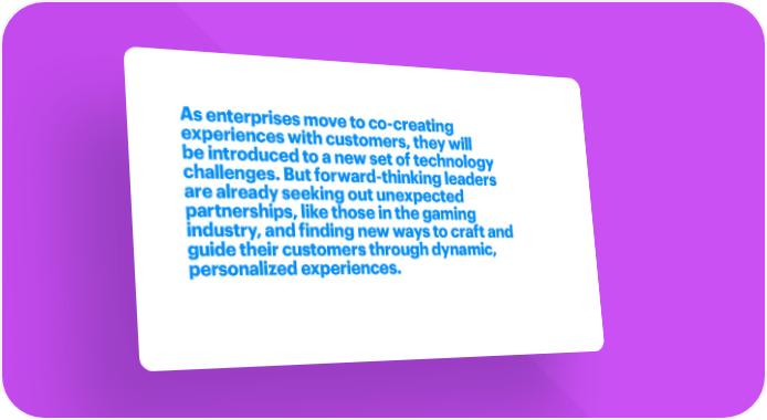 As enterprises move to co-creating experiences with customers, they will be introduced to a new set of technology challenges. But forward-thinking leaders are already seeking out unexpected partnerships, like those in the gaming industry, and finding new ways to craft and guide their customers through dynamic, personalized experiences.