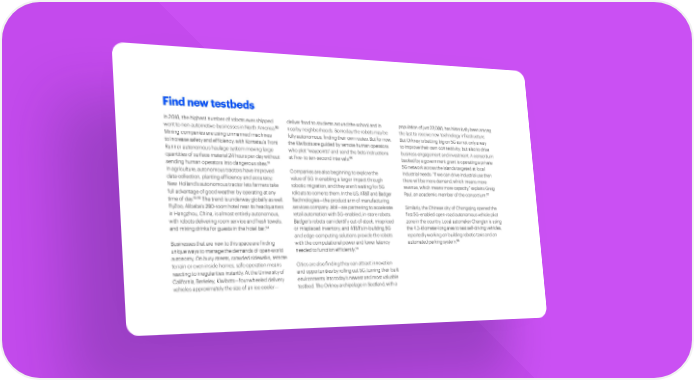 Find new testbeds In 2018, the highest number of robots ever shipped deliver food to students around the school and in population of just 22,000, has historically been among 50 went to non-automotive businesses in North America. nearby neighborhoods. Someday the robots may be the last to receive new technology infrastructure. Mining companies are using unmanned machines fully autonomous, finding their own routes. But for now, But Orkney is betting big on 5G as not only a way to increase safety and efficiency, with Komatsu’s Front the Kiwibots are guided by remote human operators to improve their own connectivity, but also to drive Runner autonomous haulage system moving large who plot “waypoints” and send the bots instructions business engagement and investment. A consortium quantities of surface material 24 hours per day without at five- to ten-second intervals.55 backed by a government grant is operating a private sending human operators into dangerous sites.51 5G network across the islands targeted at local In agriculture, autonomous tractors have improved Companies are also beginning to explore the industrial needs: “If we can drive industrial use then data collection, planting efficiency and accuracy; value of 5G in enabling a larger impact through there will be more demand, which means more New Holland’s autonomous tractor lets farmers take robotic migration, and they aren’t waiting for 5G revenue, which means more capacity,” explains Greig full advantage of good weather by operating at any rollouts to come to them. In the US, AT&T and Badger Paul, an academic member of the consortium.57 52,53 time of day. The trend is underway globally as well. Technologies—the product arm of manufacturing FlyZoo, Alibaba’s 290-room hotel near its headquarters services company Jabil—are partnering to accelerate Similarly, the Chinese city of Chongqing opened the in Hangzhou, China, is almost entirely autonomous, retail automation with 5G-enabled, in-store robots. first 5G-enabled open-road autonomous vehicle pilot with robots delivering room service and fresh towels, Badger’s robots can identify out-of-stock, mispriced zone in the country. Local automaker Chang’an is using and mixing drinks for guests in the hotel bar.54 or misplaced inventory, and AT&T’s in-building 5G the 4.3-kilometer-long area to test self-driving vehicles, and edge-computing solutions provide the robots reportedly working on building robotic taxis and an Businesses that are new to this space are finding with the computational power and lower latency automated parking system.58 unique ways to manage the demands of open-world needed to function efficiently.56 autonomy. On busy streets, crowded sidewalks, remote terrain or even inside homes, safe operation means Cities are also finding they can attract innovation reacting to irregularities instantly. At the University of and opportunities by rolling out 5G, turning their built California, Berkeley, Kiwibots—four-wheeled delivery environments into today’s newest and most valuable vehicles approximately the size of an ice cooler— testbed. The Orkney archipelago in Scotland, with a
