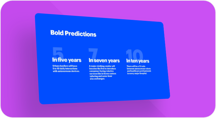Bold Predictions 5 7 10 In five years In seven years In ten years Urban dwellers will have A major clothing retailer will There will be a 1:1 ratio 5 to 10 daily interactions become the first to introduce between autonomous robots with autonomous devices. consumer-facing robotics and healthcare professionals services like in-home custom in every major hospital. tailoring and same-hour size exchanges.