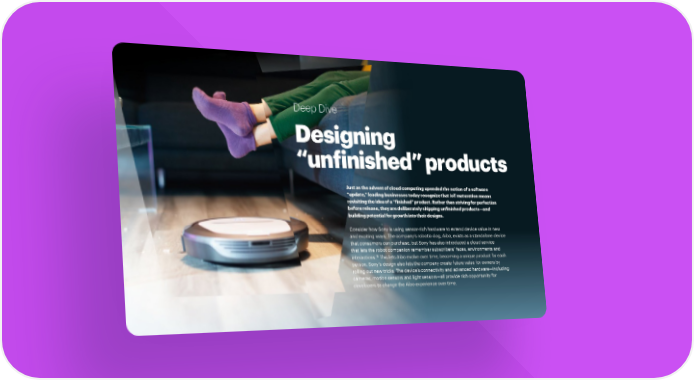 Deep Dive Designing “unfinished” products Just as the advent of cloud computing upended the notion of a software “update,” leading businesses today recognize that IoT maturation means revisiting the idea of a “finished” product. Rather than striving for perfection before release, they are deliberately shipping unfinished products—and building potential for growth into their designs. Consider how Sony is using sensor-rich hardware to extend device value in new and exciting ways. The company’s robotic dog, Aibo, exists as a standalone device that consumers can purchase, but Sony has also introduced a cloud service that lets the robot companion remember subscribers’ faces, environments and 16 interactions. This lets Aibo evolve over time, becoming a unique product for each person. Sony’s design also lets the company create future value for owners by rolling out new tricks. The device’s connectivity and advanced hardware—including cameras, motion sensors and light sensors—all provide rich opportunity for developers to change the Aibo experience over time.