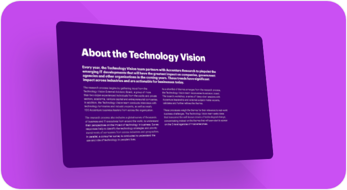 About the Technology Vision Every year, the Technology Vision team partners with Accenture Research to pinpoint the emerging IT developments that will have the greatest impact on companies, government agencies and other organizations in the coming years. These trends have significant impact across industries and are actionable for businesses today. The research process begins by gathering input from the As a shortlist of themes emerges from the research process, Technology Vision External Advisory Board, a group of more the Technology Vision team reconvenes its advisory board. than two dozen experienced individuals from the public and private The board’s workshop, a series of ‘deep-dive’ sessions with sectors, academia, venture capital and entrepreneurial companies. Accenture leadership and external subject-matter experts, In addition, the Technology Vision team conducts interviews with validates and further refines the themes. technology luminaries and industry experts, as well as nearly 100 Accenture business leaders from across the organization. These processes weigh the themes for their relevance to real-world business challenges. The Technology Vision team seeks ideas The research process also includes a global survey of thousands that transcend the well-known drivers of technological change, of business and IT executives from around the world, to understand concentrating instead on the themes that will soon start to appear their perspectives on the impact of technology in business. Survey on the C-level agendas of most enterprises. responses help to identify the technology strategies and priority investments of companies from across industries and geographies. In parallel, a consumer survey is conducted to understand the use and role of technology in people’s lives.
