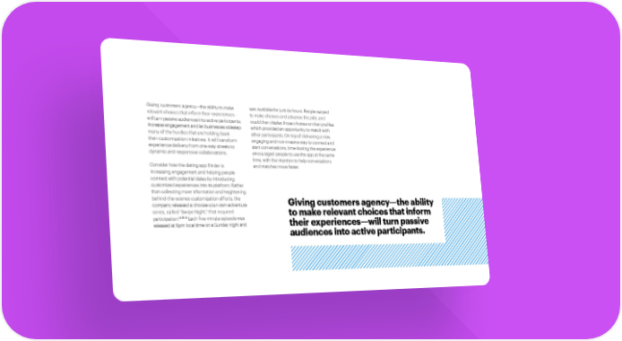 Giving customers agency—the ability to make was available for just six hours. People swiped relevant choices that inform their experiences— to make choices and advance the plot, and will turn passive audiences into active participants, could then display those choices on their profiles, increase engagement and let businesses sidestep which provided an opportunity to match with many of the hurdles that are holding back other participants. On top of delivering a new, their customization initiatives. It will transform engaging and non-invasive way to connect and experience delivery from one-way streets to start conversations, time-boxing the experience dynamic and responsive collaborations. encouraged people to use the app at the same time, with the intention to help conversations Consider how the dating app Tinder is and matches move faster. increasing engagement and helping people connect with potential dates by introducing customized experiences into its platform. Rather than collecting more information and heightening behind-the-scenes customization efforts, the Giving customers agency—the ability company released a choose-your-own-adventure series, called “Swipe Night,” that required to make relevant choices that inform 14,15,16 participation. Each five-minute episode was their experiences—will turn passive released at 6pm local time on a Sunday night and audiences into active participants.
