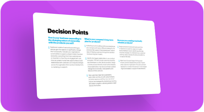Decision Points How is your business responding to What is your company’s long-term How are you creating maximally the changing nature of ownership plan for products? valuable products? with the products you sell? As the focus turns to selling continuous experiences, Design products to evolve and grow over time Traditional models of ownership are shifting as your company will need a different strategy for the in response to customer usage and insights. devices gain the capacity to significantly change products that support those experiences. Explore Build a feedback loop by identifying what data their functionality. Evaluate your organization’s ways of helping customers through this transition would be necessary to understand your customers’ current ability to support a shared model of product to ensure long-term loyalty. evolving needs. Develop the tools and platforms ownership: everything from how customers are to capture that data. on-boarded, to how they are engaged with over Identify the biggest stakeholders in your product time can present myriad new opportunities to build ecosystem. This will include customers as well as Make future-focused design thinking a part relationships with customers, but it requires changes app developers or other device providers. Design of every product development process. Explore across the organization (from product development, a review process that will uncover what obstacles what customers might want in five years and work to marketing, to support). these stakeholders may face as software updates backward to consider what sensors or technologies change the functionality, interoperability and might be necessary to support those ambitions. features of their products. Help customers meet their sustainability goals. What can they do with aging hardware, and what expenses will they incur over time? Explore new strategies like developing a recycling and trade-in program or allowing people to repair devices themselves.