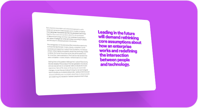 Every business assumption and entrenched approach is up for review and reinvention toward people-centric models. Companies Leading in the future must reengineer the experiences that bring people and technology together; they must raise questions about the democratization will demand rethinking of data and technology, and they must reevaluate the application and value of intelligence—what technology is providing for people, and the ways it’s changing people in the process. core assumptions about This reimagination of the enterprise offers tremendous opportunity how an enterprise to those that take the lead. In every industry, companies’ current successes are happening in spite of their foundations, not because works and redefining of them. When leaders successfully rebuild their technology models to deliver the human focus they’ve lost, they will be poised to do far more than meet expectations. They’ll set the new standard that the intersection every competitor—in every industry—will be forced to try to meet. between people Getting there is the greatest challenge the C-suite will face during the next decade. The success of the next generation of products and technology. and services will rest on companies’ ability to elevate the human experience. None of the steps on the journey are incremental changes, nor are they as simple as finding the next technological tool to do what you’re already doing today. Leading in the future will demand rethinking core assumptions about how an enterprise works and redefining the intersection between people and technology.