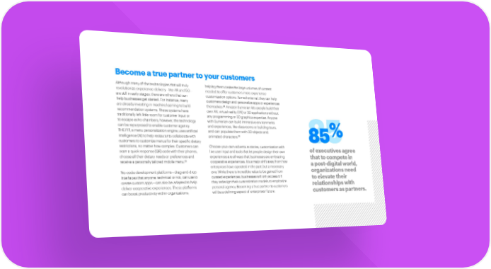 Become a true partner to your customers Although many of the technologies that will truly helping them create the large volumes of content revolutionize experience delivery—like AR and 5G— needed to offer customers more experience are still in early stages, there are others that can customization options. Turned external, they can help help businesses get started. For instance, many customers design and personalize apps or experiences are already investing in machine learning to build themselves.24 Amazon Sumerian lets people build their recommendation systems. These systems have own AR, virtual reality (VR) or 3D applications without traditionally left little room for customer input or any programming or 3D graphics expertise. Anyone to escape echo chambers; however, the technology with Sumerian can build immersive environments can be repurposed to enable customer agency. and experiences, like classrooms or building tours, THE.FIT, a menu personalization engine, uses artificial and can populate them with 3D objects and % intelligence (AI) to help restaurants collaborate with animated characters.25 85 85 customers to customize menus for their specific dietary restrictions, no matter how complex. Customers can Choose-your-own-adventure stories, customization with of executives agree scan a quick response (QR) code with their phones, live user input and tools that let people design their own choose all their dietary needs or preferences and experiences are all ways that businesses are embracing that to compete in receive a personally tailored mobile menu.23 cooperative experiences. It’s a major shift away from how a post-digital world, enterprises have operated in the past, but a necessary organizations need No-code development platforms—drag-and-drop one. While there is incredible value to be gained from interfaces that anyone, technical or not, can use to curated experiences, businesses will only access it if to elevate their create custom apps—can also be adapted to help they redesign their customization models to emphasize relationships with deliver cooperative experiences. These platforms personal agency. Becoming a true partner to customers can boost productivity within organizations, will be a defining aspect of enterprises’ future. customers as partners.