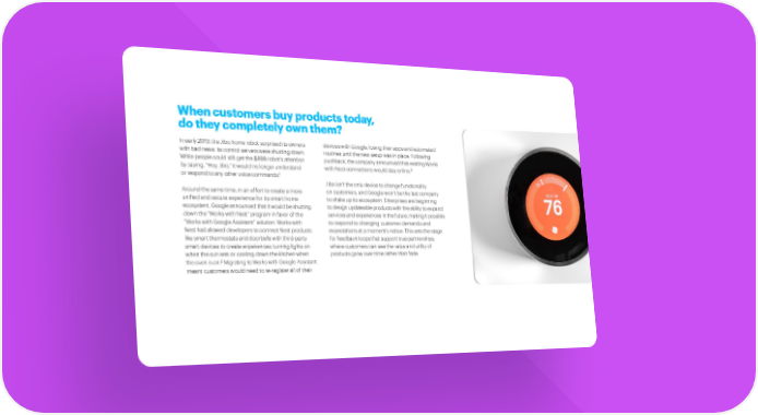 When customers buy products today, do they completely own them? In early 2019, the Jibo home robot surprised its owners devices with Google, losing their apps and automated with bad news: its control servers were shutting down. routines until the new setup was in place. Following While people could still get the $899 robot’s attention pushback, the company announced that existing Works by saying, “Hey, Jibo,” it would no longer understand with Nest connections would stay online.3 1 or respond to any other voice commands. Jibo isn’t the only device to change functionality Around the same time, in an effort to create a more on customers, and Google won’t be the last company unified and secure experience for its smart home to shake up its ecosystem. Enterprises are beginning ecosystem, Google announced that it would be shutting to design updateable products with the ability to expand down the “Works with Nest” program in favor of the services and experiences in the future, making it possible “Works with Google Assistant” solution. Works with to respond to changing customer demands and Nest had allowed developers to connect Nest products expectations at a moment’s notice. This sets the stage like smart thermostats and doorbells with third-party for feedback loops that support true partnerships, smart devices to create experiences: turning lights on where customers can see the value and utility of when the sun sets or cooling down the kitchen when products grow over time rather than fade. 2 the oven is on. Migrating to Works with Google Assistant meant customers would need to re-register all of their