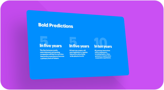 Bold Predictions 5 5 10 In five years In five years In ten years The line between media At least one country will All customer interactions entertainment and gaming pass legislation to regulate will be multisensory, companies will blur as real-time interactive advertising including haptics, vision, interactive experiences become in the physical world. gestures or sound to drive a primary form of leisure. cooperative experiences.