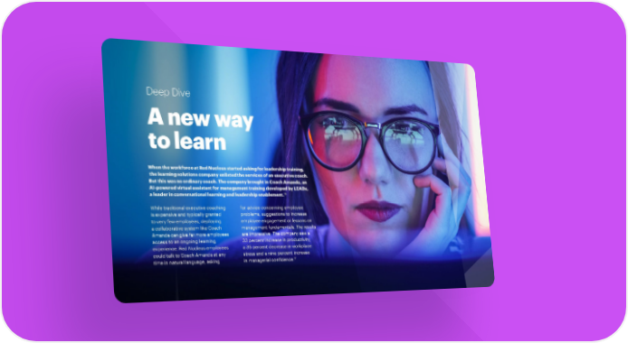 Deep Dive A new way to learn When the workforce at Red Nucleus started asking for leadership training, the learning solutions company enlisted the services of an executive coach. But this was no ordinary coach. The company brought in Coach Amanda, an AI-powered virtual assistant for management training developed by LEADx, 16 a leader in conversational learning and leadership enablement. While traditional executive coaching for advice concerning employee is expensive and typically granted problems, suggestions to increase to very few employees, deploying employee engagement or lessons on a collaborative system like Coach management fundamentals. The results Amanda can give far more employees are impressive: The company saw a access to an ongoing learning 33 percent increase in productivity, experience. Red Nucleus employees a 35 percent decrease in workplace could talk to Coach Amanda at any stress and a nine percent increase 17 time in natural language, asking in managerial confidence.