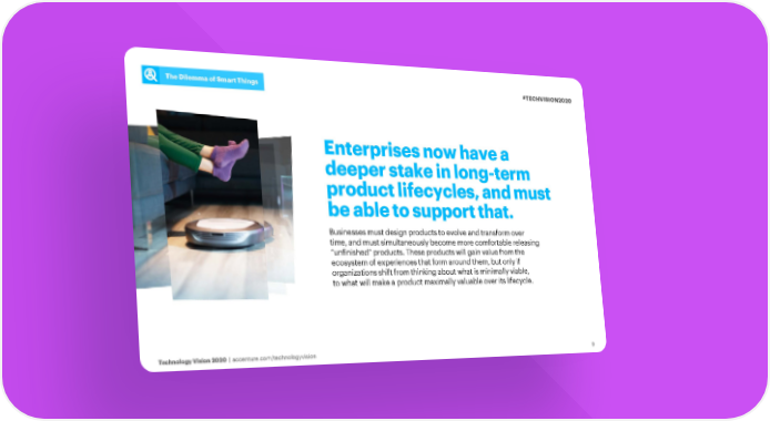 The Dilemma of Smart Things #TECHVISION2020 Enterprises now have a deeper stake in long-term product lifecycles, and must be able to support that. Businesses must design products to evolve and transform over time, and must simultaneously becomemore comfortablereleasing “unfinished” products. These products will gain value from the ecosystem of experiences that form around them, but only if organizations shift from thinking about what is minimally viable, to what will make a product maximally valuable over its lifecycle. Technology Vision 2020 | accenture.com/technologyvision 9