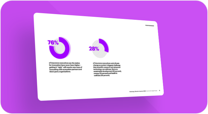 #TECHVISION2020 76% 28% of insurance executives say the stakes of insurance executives rank climate for innovation have never been higher— change as society’s biggest challenge getting it “right” will require new ways of that scientific research and advanced innovating with ecosystem partners and technology can address. Next are third-party organizations. sustainable development (22 percent), energy (19 percent) and health & wellness (19 percent). Technology Vision for Insurance 2020 | We, the Post-Digital People 57