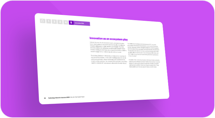 1 2 3 4 5 Innovation DNA Innovation as an ecosystem play Not every business has the resources to open a dedicated innovation The Collaborative facilitates joint development of DLT use cases hub or make big bets on insurtech investment. But all can translate the and creation of shared services between a community of insurance innovation attitude and mindset into their own strategies. Plus, there carriers, reinsurers, brokers, and agents. Based on proof of insurance are some problems that will be best solved through ecosystem-based and first notice of loss use cases in auto personal lines, the RiskStream innovation strategies, be it those venture-backed partnerships, academic Collaborative estimates its members could save between $19 million research engagements or relationships with other companies. and $68 million in the first year of use and between $99 million and $277 million in year three by implementing blockchain applications 57 in the US market. The Institutes RiskStream Collaborative, an initiative from more than 40 members of The Institutes—a non-profit knowledge partner for the risk and insurance industry—shows how this approach could benefit the Innovation, then, is evolving. Success in the future means constantly industry and its customers. The members of the consortium are working exploring what’s ahead, around and inside of the business. Insurance together to develop DLT use cases and solutions for the wider industry. leaders will seize opportunities through each of today’s innovation building blocks and form their own unique innovation DNA. Those that do will thrive in the next wave of industry transformation. 56 Technology Vision for Insurance 2020 | We, the Post-Digital People