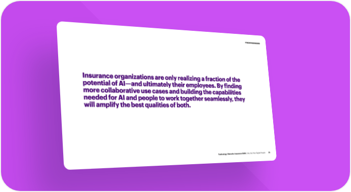 #TECHVISION2020 Insurance organizations are only realizing a fraction of the potential of AI—and ultimately their employees. By finding more collaborative use cases and building the capabilities needed for AI and people to work together seamlessly, they will amplify the best qualities of both. Technology Vision for Insurance 2020 | We, the Post-Digital People 23
