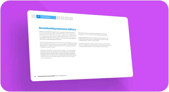 1 The I in Experience 2 3 4 5 Revolutionizing experience delivery Enterprises that are exploring cooperative experiences today are launching Although many of the technologies that will truly revolutionize experience delivery— like augmented reality (AR) and 5G—are still in early stages, there are others that can a new generation of customization, fit for future capabilities and expectations. help insurance carriers get started. For instance, many insurers are already investing in machine learning in functions such as underwriting and claims. These systems Those wanting to keep up, and stay competitive and relevant, will need to start have traditionally left little room for customer input; however, the technology can be building reputations as insurance companies that amplify customers through repurposed to enable greater levels of interaction. curated experiences, rather than marginalizing them. AXA XL’s Connected Cargo solution, for example, is a real-time digital cargo tracking Choose-your-own-adventure stories, customization with live user input and tools solution designed to help customers optimize their supply chain. Connected Cargo that let people design their own experiences are all ways that insurers are embracing gives clients 24/7 monitoring as well as access to AXA XL’s risk engineers’ expertise cooperative experiences that provide value and align to customers’ values. 20 to develop loss prevention plans. The solution uses data from sensors placed on containers—such as geolocation, temperature and humidity fluctuations, door opening and shock—to enable risk engineering experts to develop impactful prevention services for transportation and logistics risks. With every shipment, the data produced by these technologies becomes richer and more valuable, enabling underwriters to more accurately price and underwrite risk. 18 Technology Vision for Insurance 2020 | We, the Post-Digital People