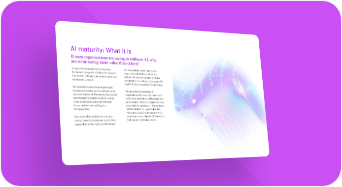 AI maturity: What it is If most organizations are racing to embrace AI, why are some seeing more value than others? To uncover strategies for AI success, not only in data and AI, but also in AI maturity measures the Accenture designed a holistic AI-maturity organizational strategy, talent and framework. Fittingly, our analysis itself was culture—to give companies a strong degree to which organizations conducted using AI. competitive advantage. (See pages 36 have mastered AI-related and 37 for key capability descriptions.) We applied machine learning models capabilities in the right to unravel massive survey datasets and This includes foundational AI uncover drivers of AI maturity that would capabilities—like cloud platforms and combination to achieve high have been impossible to detect using tools, data platforms, architecture and more traditional analytical methods governance—that are required to keep performance for customers, (more on the methodology in pace with competitors. It also includes the Appendix). “differentiation” AI capabilities, like shareholders and employees. AI strategy and C-suite sponsorship, Our research found that AI maturity combined with a culture of innovation comes down to mastering a set of key that can set companies apart. capabilities in the right combinations— The art of AI maturity—Advancing from practice to performance 9