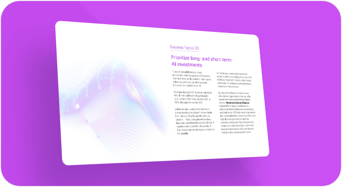 Success Factor 05 Prioritize long- and short-term "I’m on a journey that doesn’t AI investments stop with a move to the cloud. To avoid being left behind, most For Achievers, continued investment companies need to aggressively increase largely involves expanding the scope of AI I’m in the middle of rebuilding their spending on data and AI. One reason to deliver maximum impact, while “cross- Achievers get more out of AI is simply pollinating” AI solutions and redeploying an organization shifting from because they invest more in it. resources in the process. being extremely operational We found that in 2018, Achievers devoted As part of its efforts to create a more into an organization that is 14% of their total technology budgets data-driven organization that can offer to AI, while in 2021 they devoted 28%. In customers highly personalized digital transformational." 2024, they plan to devote 34%. service, Walgreens Boots Alliance migrated from legacy databases to Francesco Tinto, global CIO, SVP, Achievers also understand that their AI advanced cloud databases and analytics, Walgreens Boots Alliance investment journey doesn’t have a finish and built some 100 high-value AI products line. There is, they frequently note, no that create detailed customer profiles “peak AI.” These companies know they and help the company better optimize have only scratched the surface of their inventory and prices. The company has AI transformations and that the quality of been committed to its data- and AI-led their investments matters just as much as transformation since 2020 and doesn't the quantity. intend to slow down anytime soon. The art of AI maturity—Advancing from practice to performance 27