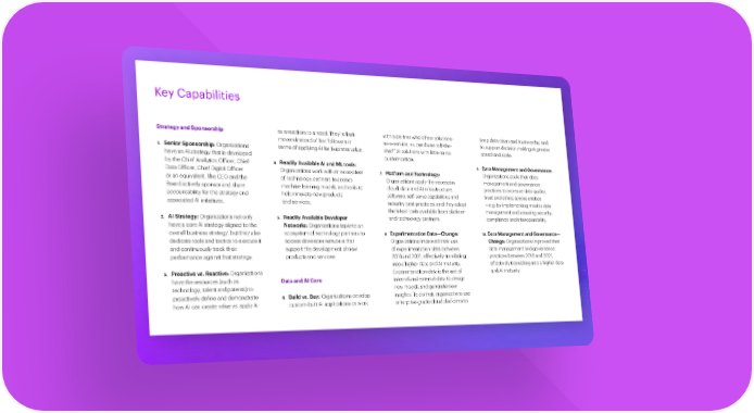 Key Capabilities Strategy and Sponsorship as a reaction to a need. They’re first- with a partner who offers solutions- keep data clean and trustworthy, and movers instead of fast followers in as-a-service, vs. purchase “off-the- to support decision making at greater 1. Senior Sponsorship: Organizations terms of applying AI for business value. shelf” AI solutions with little-to-no speed and scale. have an AI strategy that is developed customization. by the Chief Analytics Officer, Chief 4. Readily Available AI and ML tools: 9. Data Management and Governance: Data Officer, Chief Digital Officer Organizations work with an ecosystem 7. Platform and Technology: Organizations scale their data or an equivalent. The CEO and the of technology partners to access Organizations apply the necessary management and governance Board actively sponsor and share machine learning models and tools cloud, data and AI infrastructure, practices to increase data quality, accountability for the strategy and to help innovate new products software, self-serve capabilities and trust and ethics across entities associated AI initiatives. and services. industry best practices, and they adopt —e.g. by implementing master data the latest tools available from platform management and ensuring security, 2. AI Strategy: Organizations not only 5. Readily Available Developer and technology partners. compliance and interoperability. have a core AI strategy aligned to the Networks: Organizations tap into an overall business strategy, but they ecosystem of technology partners 8. Experimentation Data—Change: 10. Data Management and Governance— also dedicate tools and tactics to to access developer networks that Organizations improved their use Change: Organizations improved their execute it and continuously track their support the development of new of experimentation data between data management and governance performance against that strategy. products and services. 2018 and 2021, effectively translating practices between 2018 and 2021, into a higher data and AI maturity. effectively translating into a higher data 3. Proactive vs. Reactive: Organizations Experimentation data is the use of and AI maturity. have the resources (such as Data and AI Core internal and external data to design technology, talent and patents) to new models and generate new proactively define and demonstrate 6. Build vs. Buy: Organizations develop insights. To do that, organizations use how AI can create value vs. apply AI custom-built AI applications or work enterprise-grade cloud platforms to The art of AI maturity—Advancing from practice to performance 37