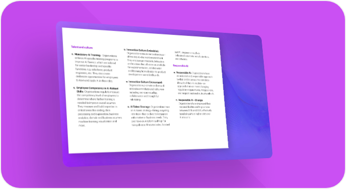 Talent and culture 13. Innovation Culture Embedded: just ML engineers—such as Organizations ensure innovation is part behavioral scientists, social scientists, 11. Mandatory AI Training: Organizations of the day-to-day work environment. and ethicists. enforce AI-specific training programs to They encourage mindsets, behaviors improve AI fluency, which are tailored and routines that all serve as a vehicle Responsible AI for senior leadership and specific for experimentation, collaboration functions, e.g. salesforce, product and learning from ideation to product 16. Responsible AI: Organizations have engineers, etc. They also create development to market launch. an industrialized, responsible approach deliberate opportunities for employees to data and AI across the complete to learn and apply AI in their roles. 14. Innovation Culture Encouraged: lifecycle of their AI models—an Organizations promote and reward approach that can meet changing 12. Employee Competency in AI- innovative mindsets and behaviors regulatory requirements, mitigate risks, Related Skills: Organizations regularly including entrepreneurship, and support sustainable, trustworthy AI. measure the competency level of collaboration and thoughtful employees to determine where further risk-taking. 17. Responsible AI—Change: training is needed to improve overall Organizations have improved their acumen. They measure and build 15. AI Talent Strategy: Organizations have responsible data and AI practices expertise in critical areas like coding, an AI talent strategy—hiring, acquiring, between 2018 and 2021, effectively data processing and exploration, retention—that evolves to keep pace translating into a higher data and business analytics, domain and with market or business needs. They AI maturity. business acumen, machine learning, also have an AI talent roadmap for visualization and more. hiring diverse AI-related roles, beyond The art of AI maturity—Advancing from practice to performance 38