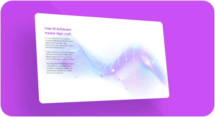 How AI Achievers master their craft It’s worth noting that the potential for AI-mature organizations will evolve along with the technology itself. High performance today will ultimately become business-as-usual tomorrow. Today’s AI Achievers have set the standard and are poised to remain leaders. While there is clearly a science to AI, they’ve shown us there is also an art to AI maturity. They have demonstrated that excellence in areas like vision and culture are just as critical as algorithmic integrity. Our research uncovered five key success factors for AI Achievers. The art of AI maturity—Advancing from practice to performance 18