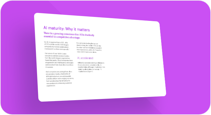 AI maturity: Why it matters Figure 1: We project that AI transformation will take less time than digital transformation There is a growing consensus that AI is absolutely essential to competitive advantage. So, it’s no surprise that in 2021, 46% The companies leading the way are of CEOs (of the world’s 2,000 largest already seeing the results—42% said that companies by market capitalization) the return on their AI initiatives exceeded 2 mentioned AI on their earnings calls. their expectations, while only 1% said the return didn’t meet expectations. Our survey of over 1,600 C-suite executives and data-science leaders AI, accelerated from the world’s largest organizations found that nearly 75% of companies have integrated AI into their business strategies With early successes building confidence and reworked their cloud plans to achieve in AI as a value-driver, we estimate that AI AI success. transformation will happen much faster than digital transformation—on average, And companies are putting those plans 16 months faster (Figure 1). Source: Accenture Research into practice: Nearly a third (30%) of Note: Our estimate is derived from a natural language processing analysis of investor calls of all AI pilot initiatives are subsequently the world’s 2,000 largest companies (by market cap), from 2010 to 2021, that referenced “AI” scaled to deliver wide-ranging outcomes, and “Digital” in tandem with “business transformation,” respectively. Data was sourced from S&P from accelerating R&D timelines for earnings transcripts. new products to enhancing customer experiences. The art of AI maturity—Advancing from practice to performance 6