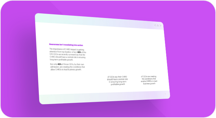 Awareness isn’t translating into action The importance of CHRO impact is gaining attention from top leaders: in fact, 89% of the 570 CEOs we recently surveyed say that the CHRO should have a central role in ensuring long-term profitable growth. But only 45% of those CEOs, by their own admission, are creating the conditions that allow CHROs to lead business growth. of CEOs say their CHRO of CEOs are creating should have a central role the conditions that in ensuring long-term enable CHROs to lead profitable growth business growth 7