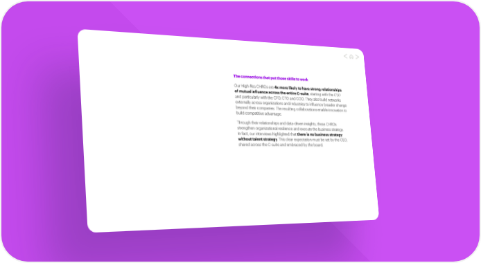 The connections that put those skills to work Our High-Res CHROs are 4x more likely to have strong relationships of mutual influence across the entire C-suite, starting with the CEO and particularly with the CFO, CTO and COO. They also build networks externally across organizations and industries to influence broader change beyond their companies. The resulting collaborations enable innovation to build competitive advantage. Through their relationships and data-driven insights, these CHROs strengthen organizational resilience and execute the business strategy. In fact, our interviews highlighted that there is no business strategy without talent strategy. This clear expectation must be set by the CEO, shared across the C-suite and embraced by the board.