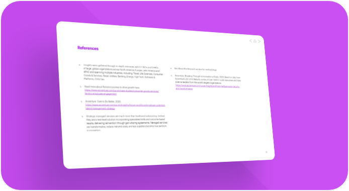 References 10. Insights were gathered through in-depth interviews with 17 CEOs and CHROs 14. See About the Research section for methodology of large, global organizations across North America, Europe, Latin America and APAC and spanning multiple industries, including: Travel, Life Sciences, Consumer 15. Accenture, Breaking Through to Innovation at Scale, 2023. Based on data from Goods & Services, Retail, Utilities, Banking, Energy, High Tech, Software & Accenture’s Art of AI Maturity survey of over 1,600 C-suite executives and data- Platforms, Oil & Gas. science leaders from the world’s largest organizations. https://www.accenture.com/us-en/insights/artificial-intelligence/ai-maturity- 11. Read more about Ferrero’s journey to drive growth here: and-transformation https://www.accenture.com/us-en/case-studies/consumer-goods-services/ ferrero-employee-engagement 12. Accenture. Care to Do Better, 2020. https://www.accenture.com/us-en/insights/future-workforce/employee-potential- talent-management-strategy 13. Strategic managed services are much more than traditional outsourcing. Instead, they are a next-level solution incorporating specialized skills and outcome-based results, delivering reinvention through gain-sharing agreements. Managed services are transformative, reduce risk and costs, and see suppliers become true partners in innovation. 36