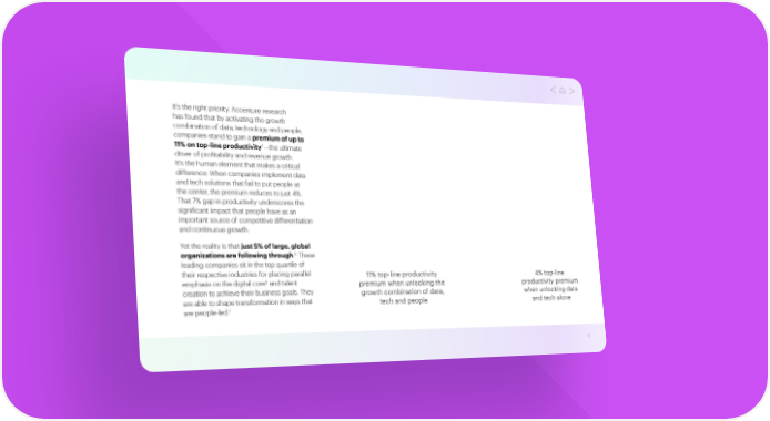 It’s the right priority. Accenture research has found that by activating the growth combination of data, technology and people, companies stand to gain a premium of up to 4 11% on top-line productivity —the ultimate driver of profitability and revenue growth. It’s the human element that makes a critical difference: When companies implement data and tech solutions that fail to put people at the center, the premium reduces to just 4%. That 7% gap in productivity underscores the significant impact that people have as an important source of competitive differentiation and continuous growth. Yet the reality is that just 5% of large, global organizations are following through.5 These leading companies sit in the top quartile of their respective industries for placing parallel 11% top-line productivity 4% top-line emphasis on the digital core6 and talent premium when unlocking the productivity premium creation to achieve their business goals. They growth combination of data, when unlocking data are able to shape transformation in ways that tech and people and tech alone 7 are people-led. 5