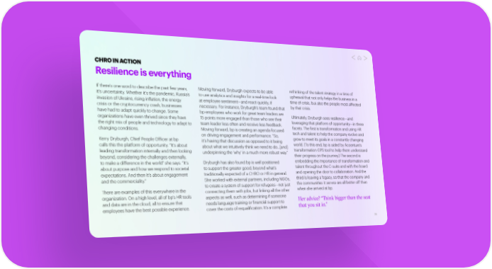 CHRO IN ACTION Resilience is everything If there’s one word to describe the past few years, Moving forward, Dryburgh expects to be able rethinking of the talent strategy in a time of it’s uncertainty. Whether it’s the pandemic, Russia’s to use analytics and insights for a real-time look upheaval that not only helps the business in a invasion of Ukraine, rising inflation, the energy at employee sentiment—and react quickly, if time of crisis, but also the people most affected crisis or the cryptocurrency crash, businesses necessary. For instance, Dryburgh’s team found that by that crisis. have had to adapt quickly to change. Some bp employees who work for great team leaders are Ultimately, Dryburgh sees resilience—and organizations have even thrived since they have 15 points more engaged than those who see their leveraging that platform of opportunity—in three the right mix of people and technology to adapt to team leader less often and receive less feedback. facets. The first is transformation and using HR changing conditions. Moving forward, bp is creating an agenda focused tech and talent to help the company evolve and on driving engagement and performance. “So, grow to meet its goals in a constantly changing Kerry Dryburgh, Chief People Officer at bp it’s having that discussion as opposed to it being world. (To this end, bp is aided by Accenture’s calls this the platform of opportunity. “It’s about about what we intuitively think we need to do…[and] transformation GPS tool to help them understand leading transformation internally and then looking underpinning the ‘why’ in a much more robust way.” their progress on the journey.) The second is beyond, considering the challenges externally, embedding the importance of transformation and to make a difference in the world” she says. “It’s Dryburgh has also found bp is well positioned about purpose and how we respond to societal to support the greater good, beyond what’s talent throughout the C-suite and with the board expectations. And then it’s about engagement traditionally expected of a CHRO or HR in general. and opening the door to collaboration. And the and the commerciality.” She worked with external partners, including NGOs, third is leaving a legacy, so that the company and to create a system of support for refugees—not just the communities it serves are all better off than There are examples of this everywhere in the connecting them with jobs, but linking all the other when she arrived at bp. organization. On a high level, all of bp’s HR tools aspects as well, such as determining if someone and data are in the cloud, all to ensure that needs language training or financial support to Her advice? “Think bigger than the seat employees have the best possible experience. cover the costs of requalification. It’s a complete that you sit in.” 28