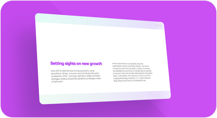 Setting sights on new growth In this environment it is abundantly clear that organizations need to accelerate change—not only to compete but also find new paths to growth. Accenture From 2017 to 2022 the level of macroeconomic, social, has identified five key forces of change that are essential geopolitical, climate, consumer and technological disruption to success in the next decade: total enterprise reinvention, 1 increased by 200%. And today, tight labor markets and talent talent, sustainability, the metaverse continuum and the shortages continue beyond the pandemic as skill gaps remain ongoing technology revolution. For C-suites looking to at high levels.2 forge ahead, these forces are showing the way. 3