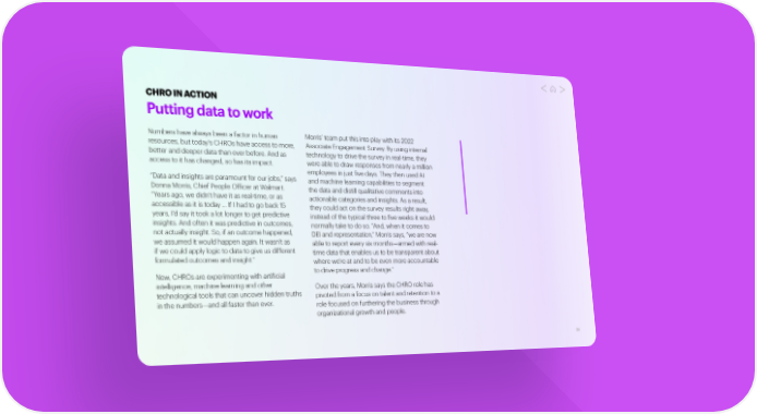CHRO IN ACTION Putting data to work Numbers have always been a factor in human Morris’ team put this into play with its 2022 resources, but today’s CHROs have access to more, Associate Engagement Survey. By using internal better and deeper data than ever before. And as technology to drive the survey in real-time, they access to it has changed, so has its impact. were able to draw responses from nearly a million employees in just five days. They then used AI “Data and insights are paramount for our jobs,” says and machine learning capabilities to segment Donna Morris, Chief People Officer at Walmart. the data and distill qualitative comments into “Years ago, we didn’t have it as real-time, or as actionable categories and insights. As a result, accessible as it is today … If I had to go back 15 they could act on the survey results right away, years, I’d say it took a lot longer to get predictive instead of the typical three to five weeks it would insights. And often it was predictive in outcomes, normally take to do so. “And, when it comes to not actually insight. So, if an outcome happened, DEI and representation,” Morris says, “we are now we assumed it would happen again. It wasn’t as able to report every six months—armed with real- if we could apply logic to data to give us different time data that enables us to be transparent about formulated outcomes and insight.” where we’re at and to be even more accountable Now, CHROs are experimenting with artificial to drive progress and change.” intelligence, machine learning and other Over the years, Morris says the CHRO role has technological tools that can uncover hidden truths pivoted from a focus on talent and retention to a in the numbers—and all faster than ever. role focused on furthering the business through organizational growth and people. 26
