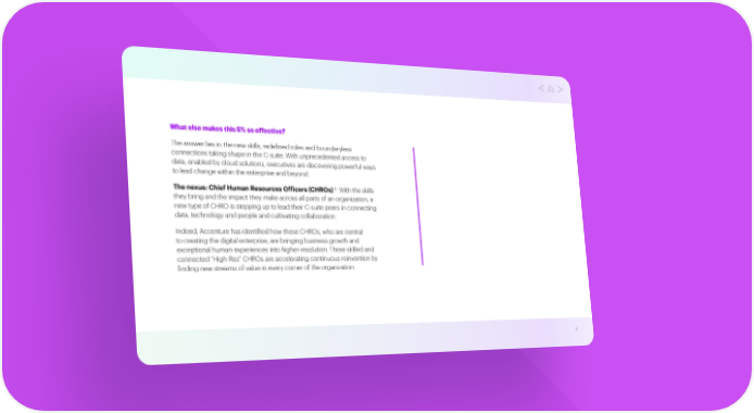 What else makes this 5% so effective? The answer lies in the new skills, redefined roles and boundaryless connections taking shape in the C-suite. With unprecedented access to data, enabled by cloud solutions, executives are discovering powerful ways to lead change within the enterprise and beyond. The nexus: Chief Human Resources Officers (CHROs).8 With the skills they bring and the impact they make across all parts of an organization, a new type of CHRO is stepping up to lead their C-suite peers in connecting data, technology and people and cultivating collaboration. Indeed, Accenture has identified how these CHROs, who are central to creating the digital enterprise, are bringing business growth and exceptional human experiences into higher resolution. These skilled and connected “High-Res” CHROs are accelerating continuous reinvention by finding new streams of value in every corner of the organization. 6