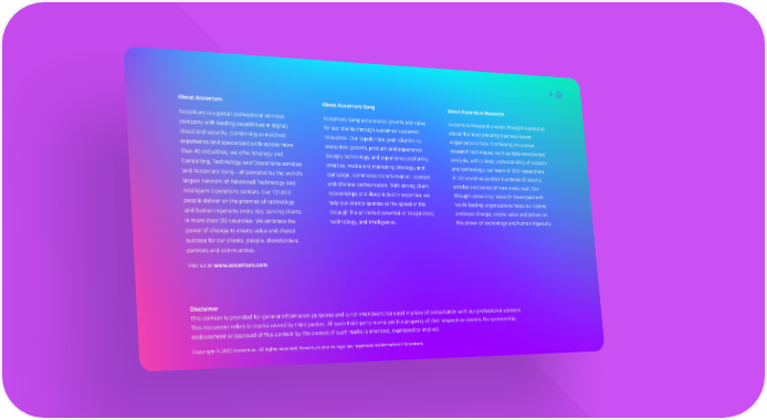 About Accenture About Accenture Song About Accenture Research Accenture is a global professional services Accenture Song accelerates growth and value Accenture Research creates thought leadership company with leading capabilities in digital, for our clients through sustained customer about the most pressing business issues cloud and security. Combining unmatched relevance. Our capabilities span ideation to organizations face. Combining innovative experience and specialized skills across more execution: growth, product and experience research techniques, such as data-science-led than 40 industries, we offer Strategy and design; technology and experience platforms; analysis, with a deep understanding of industry Consulting, Technology and Operations services creative, media and marketing strategy; and and technology, our team of 300 researchers and Accenture Song—all powered by the world’s campaign, commerce transformation, content in 20 countries publish hundreds of reports, largest network of Advanced Technology and and channel orchestration. With strong client articles and points of view every year. Our Intelligent Operations centers. Our 721,000 relationships and deep industry expertise, we thought-provoking research developed with people deliver on the promise of technology help our clients operate at the speed of life world leading organizations helps our clients and human ingenuity every day, serving clients through the unlimited potential of imagination, embrace change, create value and deliver on in more than 120 countries. We embrace the technology, and intelligence. the power of technology and human ingenuity. power of change to create value and shared success for our clients, people, shareholders, partners and communities. Visit us at www.accenture.com Disclaimer This content is provided for general information purposes and is not intended to be used in place of consultation with our professional advisors. This document refers to marks owned by third parties. All such third-party marks are the property of their respective owners. No sponsorship, endorsement or approval of this content by the owners of such marks is intended, expressed or implied. The life-centric playbook 30 Copyright © 2022 Accenture. All rights reserved. Accenture and its logo are registered trademarks of Accenture.