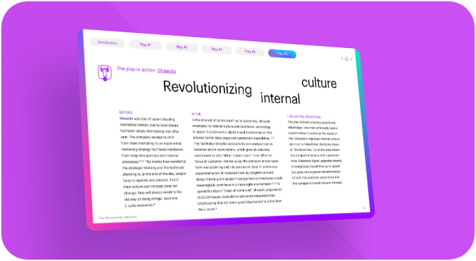 Introduction Play #1 Play #2 Play #3 Play #4 Play #5 The play in action: Shiseido culture Revolutionizing internal BEFORE: AFTER: THE LASTING ADVANTAGE: Shiseido was one of Japan’s leading In the interest of better reaching its customers, Shiseido This play delivers a lasting operational cosmetics brands, but its local shares revamped its internal culture and its internal technology advantage—one that continually opens had been slowly decreasing year after in Japan. It underwent a digital cloud transformation that opportunities to evolve at the speed of 27, 28 life. Shiseido’s improved internal culture year. The company wanted to shift allowed better data usage and operational capabilities. from mass marketing to an experiential This facilitated broader access to its skin analysis tool on set it up to make faster decisions closer marketing strategy but faced resistance websites and in-store tablets, which grew its websites’ to “the front line,” i.e. at the sites where from long-time partners and internal 27 the company interacts with customers’ reach users to 230 million in just a year. In an effort to processes.26, 27 “No matter how wonderful focus on customer lifetime value, the company moved away lives. Shiseido’s digital upgrades started the strategic thinking and the technical from over planning and risk aversion in favor of continuous to bring basic capabilities up to speed planning is, at the end of the day, people experimentation. It instituted training programs around but grew into a greater transformation have to operate and execute. And if design thinking and project management so employees could of both the customer experience and 27, 29 the company’s overall cultural mindset. their culture and mindset does not meaningfully contribute to a more agile environment. To change, they will always revert to the upend the idea of “chain of command,” Shiseido empowered old way of doing things,” says one its 8,000 beauty consultants with more responsibilities, 26 C-suite executive. emphasizing that not every good idea needed to come from 27 the C-suite. The life centricity playbook 24