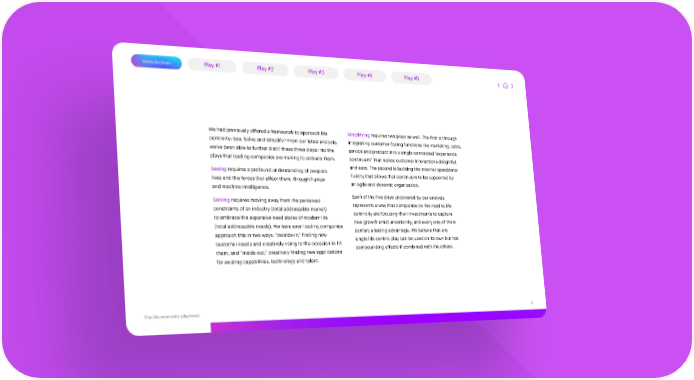 Introduction Play #1 Play #2 Play #3 Play #4 Play #5 We had previously offered a framework to approach life Simplifying requires two plays as well. The first is through 3 integrating customer-facing functions like marketing, sales, centricity: See, Solve and Simplify. From our latest analysis, we’ve been able to further distill these three steps into the service and product into a single connected “experience plays that leading companies are making to activate them. continuum” that makes customer interactions delightful Seeing requires a profound understanding of people’s and easy. The second is building the internal operational lives and the forces that affect them, through human fluidity that allows that continuum to be supported by and machine intelligence. an agile and dynamic organization. Solving requires moving away from the perceived Each of the five plays uncovered by our analysis constraints of an industry (total addressable market) represents a way that companies on the road to life to embrace the expansive need states of modern life centricity are focusing their investments to capture (total addressable needs). We have seen leading companies new growth amid uncertainty, and every one of them approach this in two ways: “outside-in,” finding new confers a lasting advantage. We believe that any customer needs and creatively rising to the occasion to fill single life-centric play can be used on its own but has them, and “inside-out,” creatively finding new applications compounding effects if combined with the others. for existing capabilities, technology and talent. The life centricity playbook 6