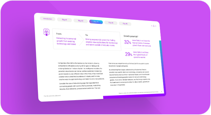 Introduction Play #1 Play #2 Play #3 Play #4 Play #5 From: To: Growth potential:* Extracting incremental Driving exponential growth by finding more likely to achieve the growth from existing creative new applications for technology 32% highest levels of revenue technology and talent and talent outside of industry norms growth from new ventures more likely to achieve 29% the highest levels of speed-to-market Companies often define themselves by their industry, drawing themselves as competition not just for taxis, but for any point-to-point comparisons with peers pursuing similar goals or taking pride movement of people and goods. in being labeled an “industry leader.” As intelligence broadens the By connecting their deeper understanding of customers’ lives to potential value brands can deliver, and as customers increasingly potential new uses for talent and technology, companies can expand permit brands to play different roles in their lives, it has never been beyond the boundaries of their traditional industry and into a broader a better time to shed the boundaries of industry and find new, ecosystem of meeting people’s needs. It’s not just a technology creative ways to apply technology and talent to solve new problems. update; it’s an entire mindset makeover, one that brings creativity into Consider the case of ride-sharing apps that expanded from the boardroom to seize opportunities for value creation, growth and connecting people with cars to offering scooters, motorbikes, relevance in the process. bicycles, food deliveries, product orders and more. They saw * Based on our analysis of survey data from companies in our study that our model determined were focused on this play. The life centricity playbook 16