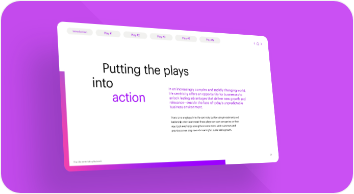 Introduction Play #1 Play #2 Play #3 Play #4 Play #5 Putting the plays into In an increasingly complex and rapidly changing world, life centricity offers an opportunity for businesses to action unlock lasting advantages that deliver new growth and relevance—even in the face of today’s unpredictable business environment. There is no single path to life centricity but focusing investments and leadership attention toward these plays can start companies on their way. Each one helps strengthen connections with customers and provides a new step toward meaningful, sustainable growth. The life centricity playbook 2525