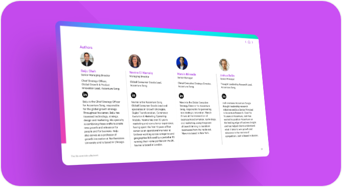 Authors Baiju Shah Nevine El-Warraky Marvin Miranda Joshua Bellin Senior Managing Director Managing Director Senior Manager Senior Principal Chief Strategy Officer, Global Consumer Goods Lead, Global Executive Strategy Director, Thought Leadership Research Lead, Global Growth & Product Accenture Song Accenture Song Accenture Song Innovation Lead, Accenture Song Baiju is the Chief Strategy Officer Nevine is the Accenture Song Marvin is the Global Executive Josh oversees Accenture Song’s for Accenture Song, responsible Global Consumer Goods Lead and Strategy Director for Accenture thought leadership research for the global growth strategy. specializes in Growth Strategies, Song, responsible for pioneering initiatives and is a Senior Principal Throughout his career, Baiju has Digital Transformation, Commerce new strategic innovation. Marvin in Accenture Research. Over his traversed technology, strategy, Evolution & Marketing Operating thrives at the intersection of 16 years at Accenture, Josh has design and marketing. His specialty Models. Nevine has over 30 years business transformation, technology, worked to position Accenture on is combining these crafts to create marketing and consultancy experience, and marketing, using the power the leading edge of business insight new growth and relevance for having spent the first 10 years of her of brand thinking to transform and has helped clients understand people and for business. Baiju career as an operational marketer at businesses from the inside out. what it takes to win growth and also serves as a professor of Unilever working across categories and Marvin is based in New York. relevance in the next era of growth innovation at Northwestern geographies followed by a period at RB competition. Josh is based in Boston. University and is based in Chicago. running their Home portfolio in the UK. Nevine is based in London. The life centricity playbook 26